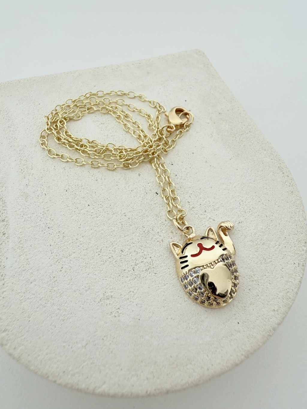 Collar Maneki Neko, una joya con cadena laminada en oro 14 k que combina belleza y significado. El dije representa al tradicional gato japonés de la suerte, conocido por atraer buena fortuna y prosperidad.