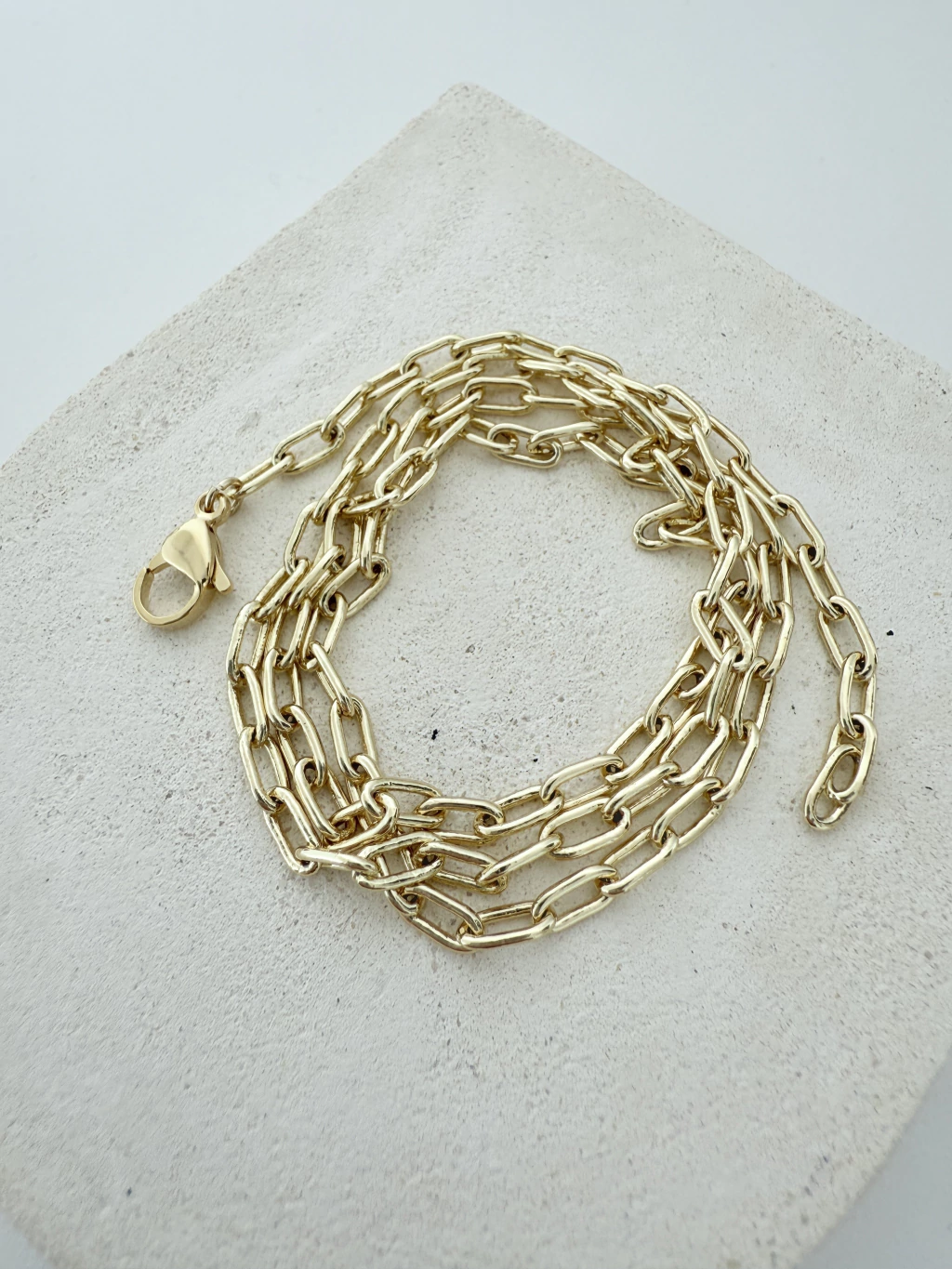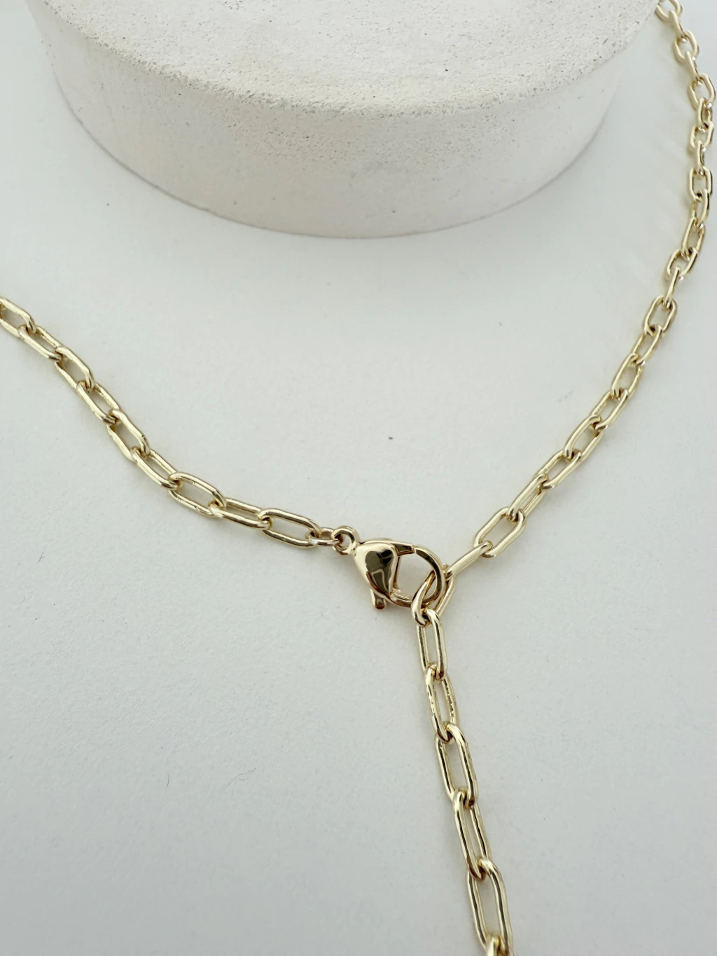 Cadena multiuso, un collar básico e innovador que se adapta a tu estilo diario. Laminado en oro 14 k, hipoalergénico y resistente. Su diseño versátil te permite usarla en la medida que prefieras, ajustando el sobrante de la cadena hacia adelante o hacia atrás, según tu gusto.