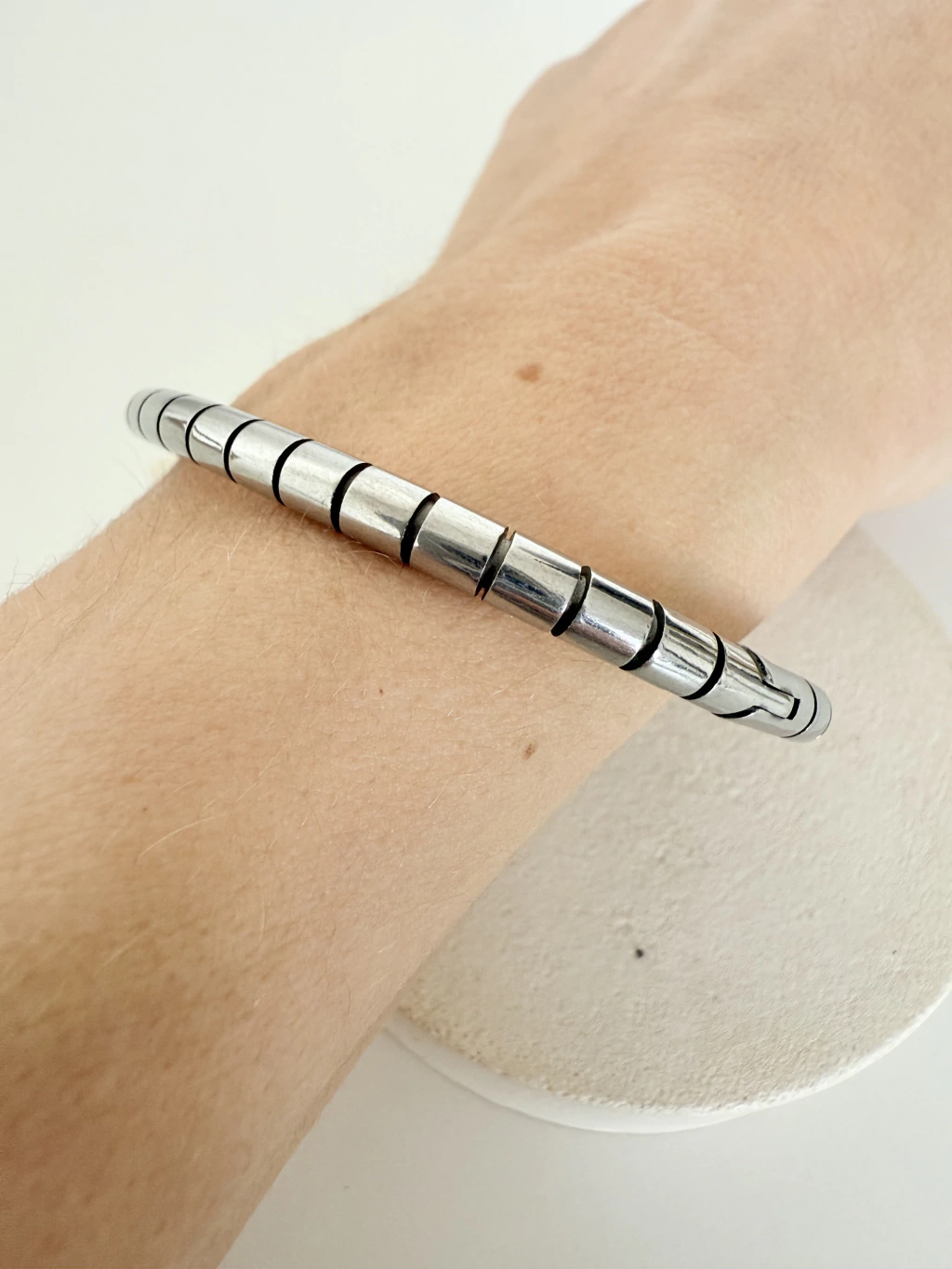 Su diseño con apertura lateral permite un ajuste fácil y personalizado, adaptándose perfectamente a tu muñeca. Esta pulsera es una opción versátil que se puede llevar tanto en ocasiones especiales como en el día a día, realzando cualquier atuendo con su elegancia contemporánea.